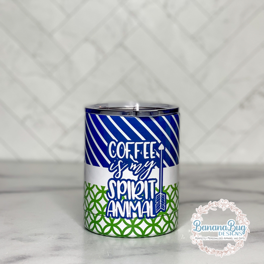 Our 10 ounce tumbler is perfect for your favorite cup of coffee, and the Coffee is my Spirit Animal design is a fun way to start your day!