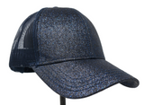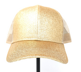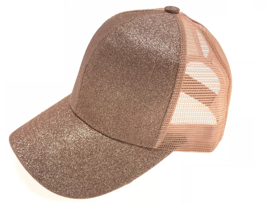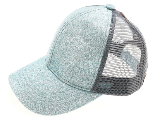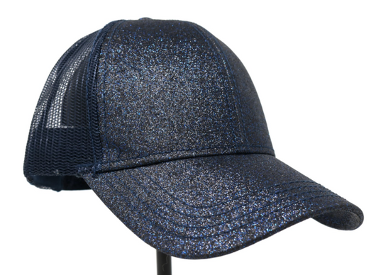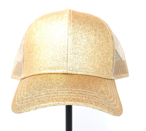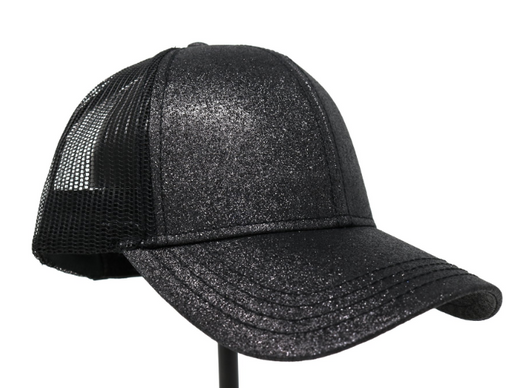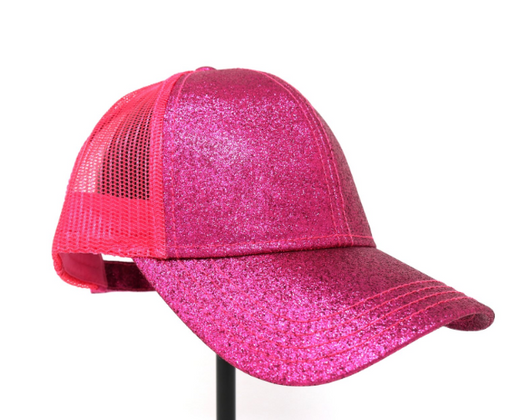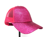 This cap features a rounded bill, a glitter front, a mesh back with a glitter Velcro adjustable back strap, and top opening for your high ponytail or messy bun.